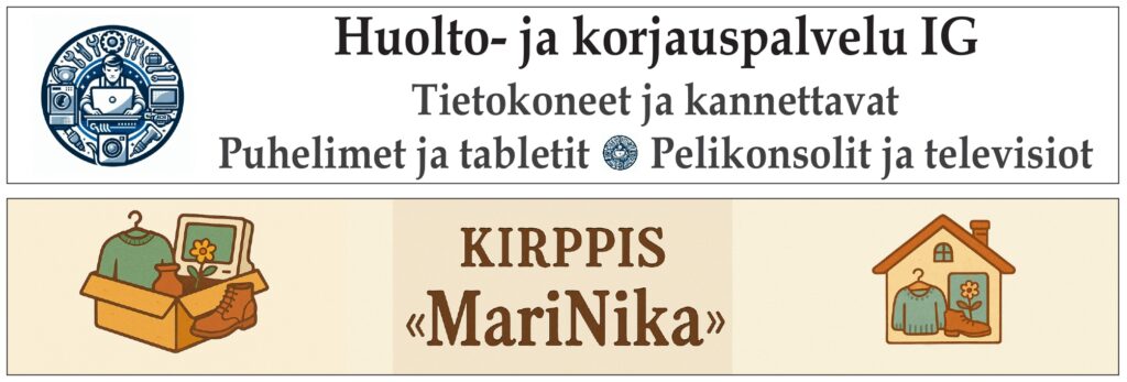 Kirpputori, jossa on runsaasti tavaraa, sekä kodinkoneiden korjaamo.
